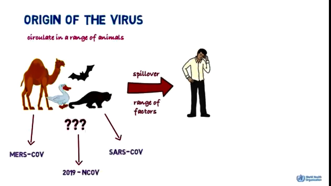 It is known that coronaviruses circulate in a range of animals. Sometimes theses viruses can make the jump from animals to human. This is called spill over and could be due to range of factors such as mutations and increase contact between humans and animals such as:
